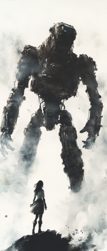 A large metal golem construct. Dark fantasy setting. Watercolor art style. Mood is eerie and ethereal. Background is partial watercolor with some white space. --ar 3:7