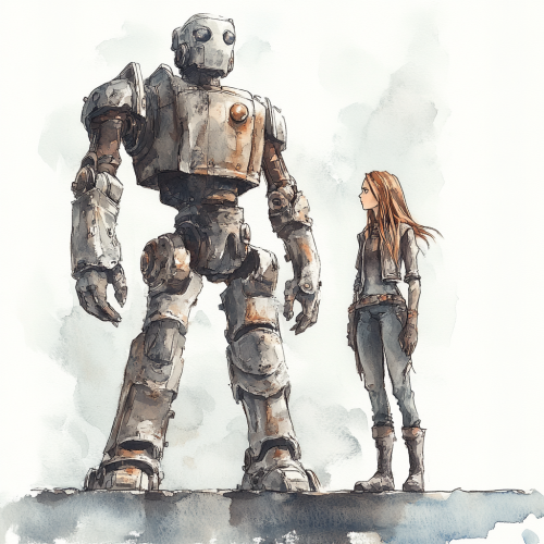 A female adventurer standing with her large metal golem construct companion. Dark fantasy setting. Watercolor art style. Mood is eerie and ethereal. Background is a medieval city, partial watercolor with some white space. --ar 3:7