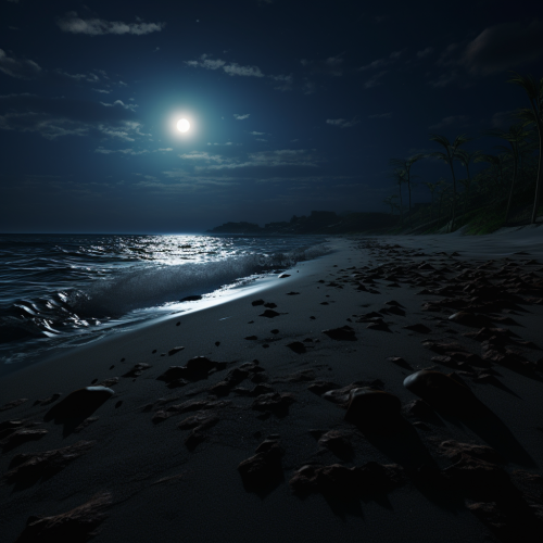A photorealistic night scene of a Miami beach, captured as if taken with a professional camera. The view is from the sandy shore looking out towards the ocean, illuminated by vibrant pink and blue lights that reflect off the water. A large full moon casts a soft, shimmering glow over the waves. The sky is deep navy, dotted with stars, enhancing the serene nighttime atmosphere. Include lush palm trees swaying gently in the breeze, adding to the tropical feel. Rendered in stunning 8K resolution for exceptional detail and clarity