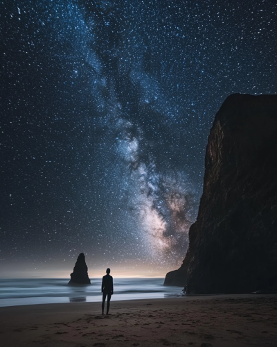 A person standing on the beach, gazing at an expansive night sky filled with stars and galaxies. A rocky cliff rises from the ocean to their right, a vast expanse of sand stretching out in front of them. A lone figure stands under the starry night sky, surrounded by towering rock formations, overlooking a serene sea, capturing the essence of solitude amidst nature's grandeur. Photography, long exposure for starry effects, f/4 aperture setting. --ar 4:5
