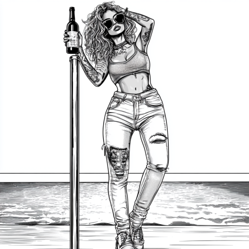 woman holding a bottle of wine in her hand, a pose on a pool dance pole, and legs bent at the knee, she has curls, stylish sunglasses, tattoos, a top, on her feet sneakers, she holds her hand near her head, she smiles, long jeans, in the background a view of the sea and a sunset, vector graphics, black and white, white background, only an outline