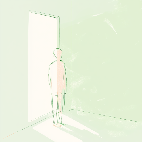 A human figure in a minimalist room, standing alone, the figure's features blurred to suggest simplicity, with cold light from a small window, everything sparse and empty. --sref 1174761156