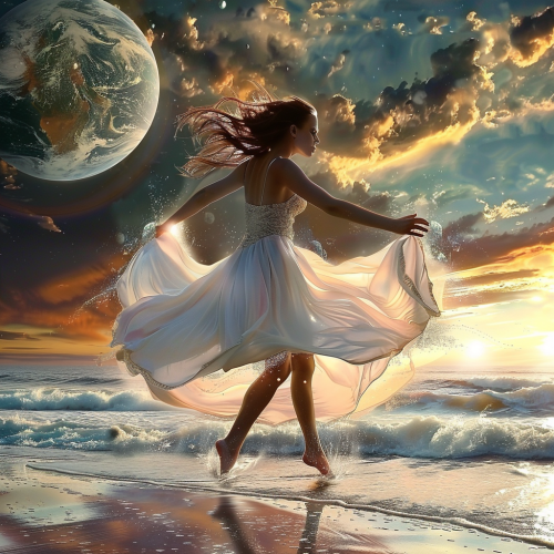 a attractive womans dancing at the beach super realistic highly detailel beautifull faces planet in the sky