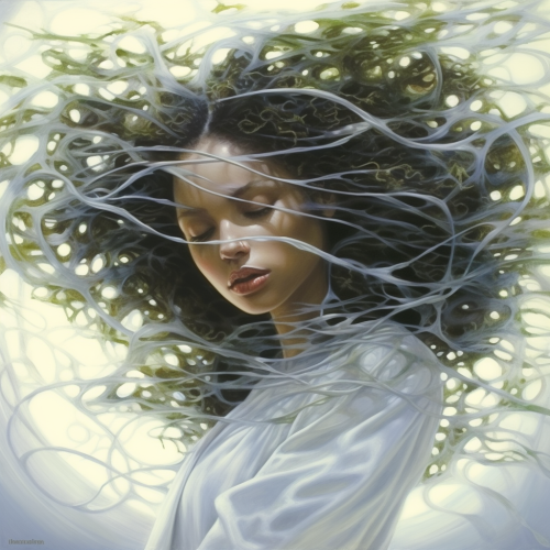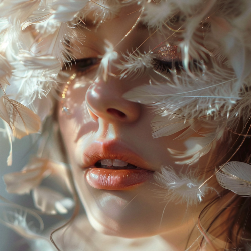 A close-up of a woman’s face adorned with delicate feathers, blending into her hair. The feathers add texture and softness, evoking a dreamy and ethereal mood. --v 6.0