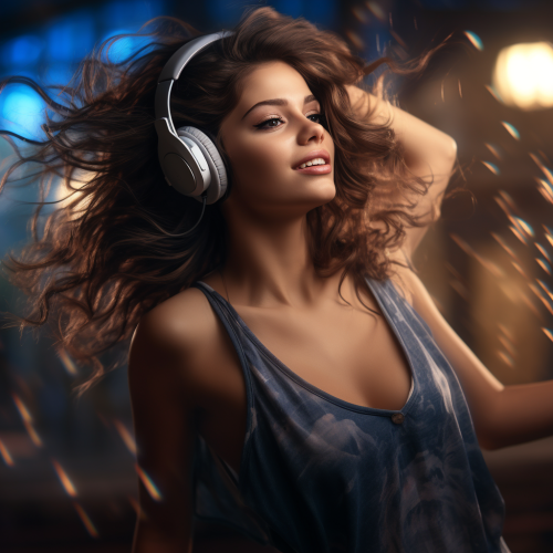 woman wearing headphones dancing. blurred background. Hyper realistic. 100mm lens