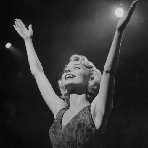 A draft of an old black-and-white photograph from the early 1960s, depicting a woman with blonde hair in her thirties, smiling while waving her arms on stage. chiaroscuro style
