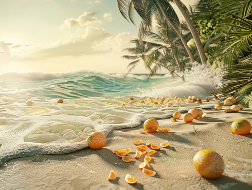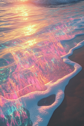 autostereographic and melancholic style, it shows a beach with sunset, the water looks like if you mixed up all diffrent oil colors, the colors mix up with the water, surreal art and melancholic, --ar 2:3 --v 6.1