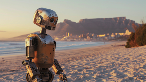 robotl, hyper realistic, looking back at camera, on beach, color photography, hyperrealistic, medium shot, table mountain in background, sunset --ar 16:9 --v 6.0