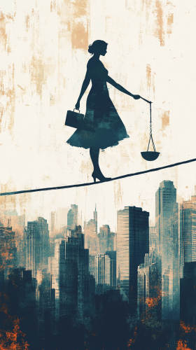 woman with office suit, , is walking a tightrope between two towering corporate skyscrapers. Below her, the busy city represents the chaotic and demanding corporate world. In one hand, she carries a briefcase, and in the other, a glowing scale, representing the balance between ambition and integrity --v 6.1 --ar 3:4