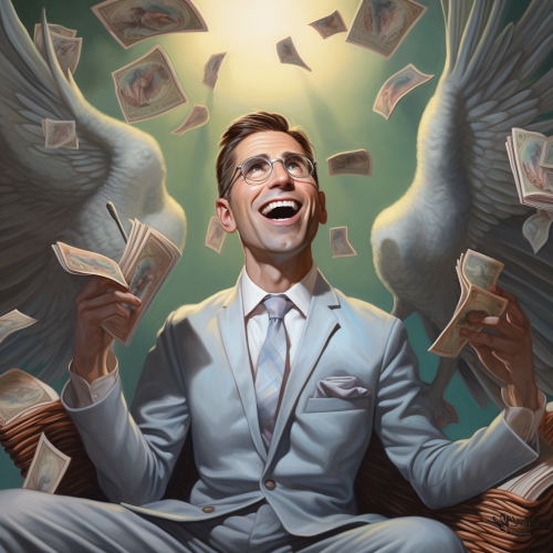 In a realistic style, draw a dentist refusing a pile of money bills, and he should have a halo over his head like an angel.