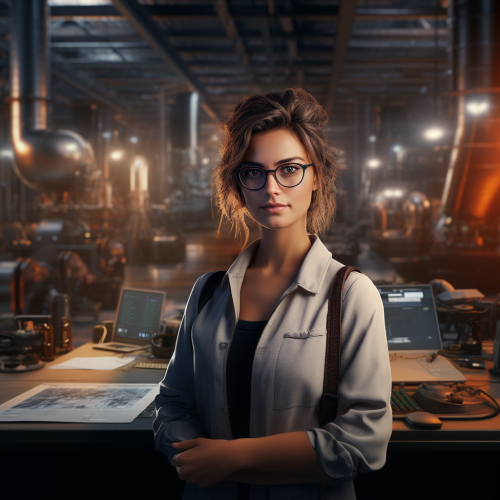 create a female COO in ultra realistic, stock picture, 8k, the background shows a Industry 4.0 factory