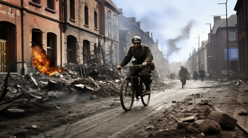 Germany during WW2, person using a bicycle or alternative transportation method as fuel for cars becomes scarce. Show the changed mobility landscape during the war --ar 16:9 --v 5.2