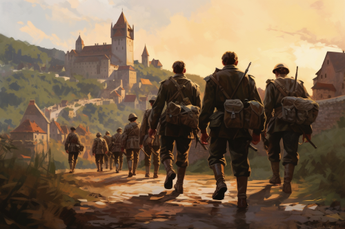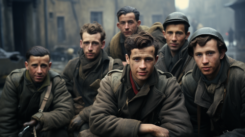 Create a hyper-realistic image of a European city during World War II, circa the 1940s. Focus on historical accuracy and rich detail. Include classic buildings in period-specific architecture, streets populated with 1940s vehicles like old cars and military transports. People should be dressed in period-appropriate attire, ranging from soldier uniforms to civilian styles. The environment should be lively but with an undercurrent of tension and uncertainty reflective of the wartime era. Place extra emphasis on coloration and textures that mirror the aesthetic of the era, such as faded, earthy colors and worn materials. The atmosphere should be a mix of everyday life and the palpable strains present during the war period - v6