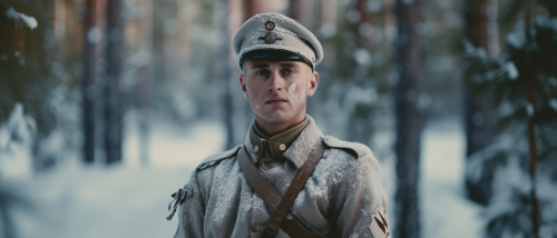 Medium close up cinematic shot of 30 years old finnish soldier in 1942 looking to distant in finnish forest at winter, wearing minimal finnish army white snow suit camo, mosing nagant rifle, low key lighting, evening sunset, soldiers in the distant background --ar 21:9 --v 5.2