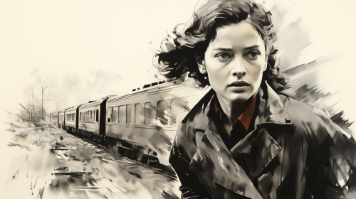 full figure, Rome 1943 a jew mother, resembling actress Charlotte Rampling, standing frightened, holding her 3-year-old son, wiyh hair cut very short in her arms, watching shocked a train departing from the Rome station, 1943, full figure painting with sepia ink , Enki Bilal style, black and white, depth of field, cinematic, 6k, --ar 16:9 --s 750