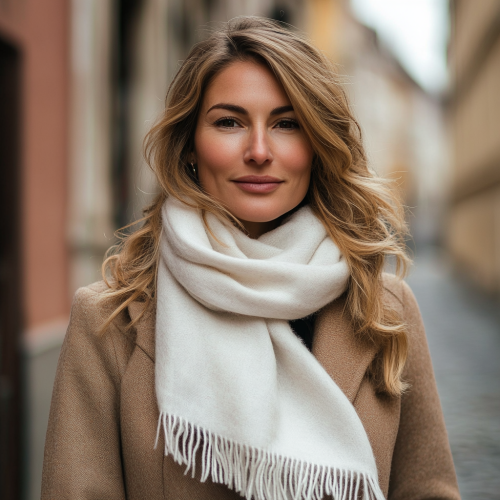 european female, mid 30's, model, facial features like Claudia Shiffer, wearing fashionable coat, scarf is white color, the scarf is made from cashmere wool , the scarf has fringed edges at both ends, standing old town street, semi blurred background, mockup photography, Full HD, high definition, shot with a canon EOS R5 F1.2 ISO100 80mm