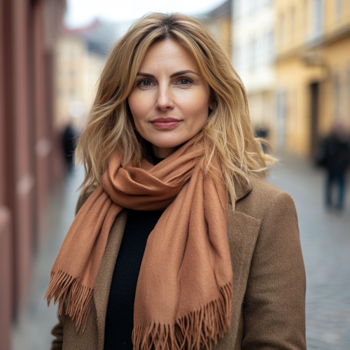 european female, mid 30's, model, facial features like Heidi Klum, wearing fashionable coat, scarf is Rosewood color, the scarf is made from cashmere wool , the scarf has fringed edges at both ends, standing old town street, semi blurred background, mockup photography, Full HD, high definition, shot with a canon EOS R5 F1.2 ISO100 80mm