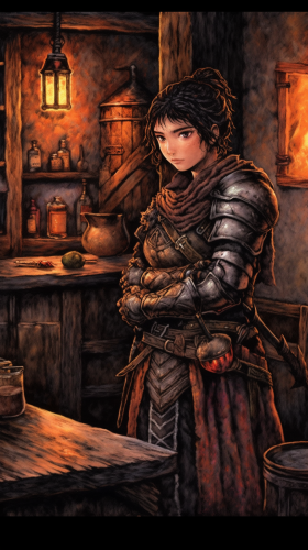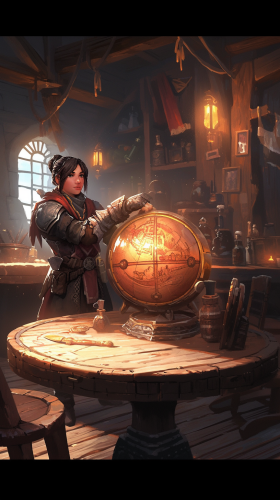 a female gnome, leather armor, red scarf, dark hair tied back in ponytail, green eyes, in a tavern, artwork, warm tones --ar 9:16 --no elf ears --niji 5