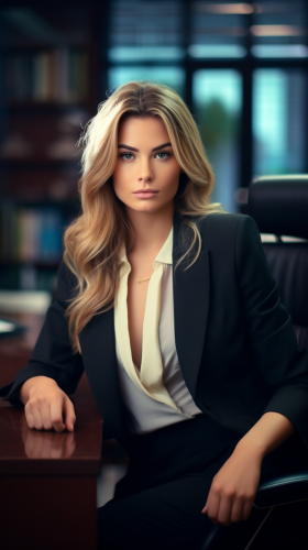 young woman blond lawyer sitting in a modern office, realistic photo, blurred background --ar 9:16