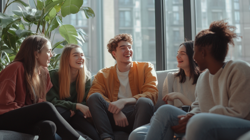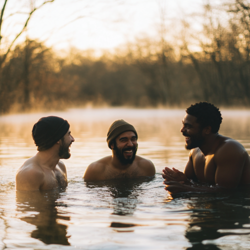 Two European Men Laughing and Talking on Red Moroccan Cushions