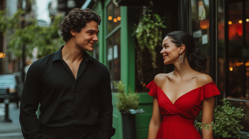 a man in all black asking a new york white women in a red dress, close up shot chest up of the men, behind is a simple green restaurant with minimalstic vibes in New York, during the middle of the day --ar 16:9
