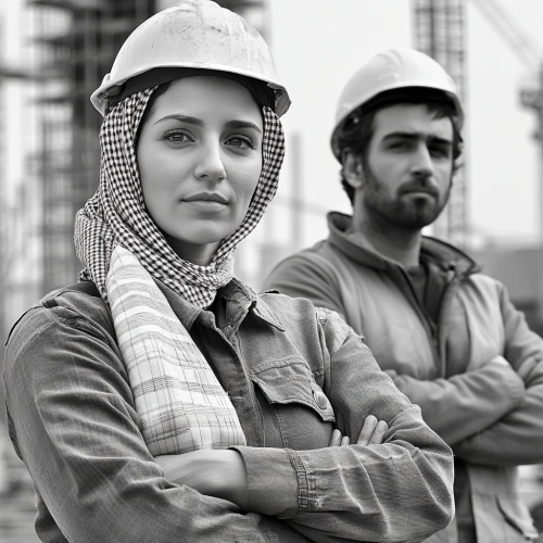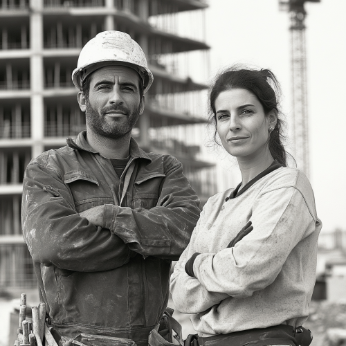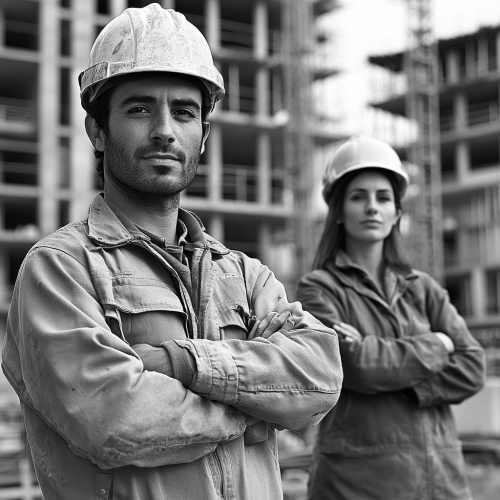 Front image of a builder Moroccan man and european architect woman and other workers with their hands folded, wearing profesional builder's clothes with helmet black and white photo with light background of building under construction with crane and other workers, clean and sharp lines