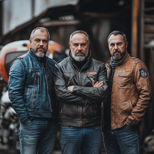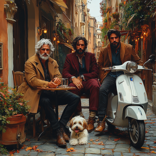 This image portrays a stylish, urban scene set in what appears to be a narrow, charming European street, likely in Italy, given the cobblestone path and architecture. The setting exudes an effortlessly cool vibe with three men as the focal point of the image. Each is dressed in distinct, elegant fashion, reflecting a refined and individual sense of style: 1.The man on the left** is dressed in a rich, camel-colored overcoat, paired with dark trousers and boots, seated at a café table. His expression is relaxed yet serious, adding to the sophisticated ambiance. 2.The man in the middle**, with a full head of striking white hair and a beard, stands out in a deep burgundy suit with colorful accents on the lapel, perhaps inspired by traditional Italian tailoring. He sits with authority, commanding the scene with his confident posture and attire. 3.The man on the right** is casually seated on a white Vespa, wearing a dark, woolen scarf and coat. His style leans more casual yet maintains a polished, effortless feel that complements the overall urban aesthetic. A fluffy dog sits near the café table, adding a sense of warmth and life to the setting. The surrounding environment, with warm-toned storefronts, hanging plants, and outdoor seating, evokes a sense of leisurely afternoon elegance, likely in a historic part of the city. The mood of the image is sophisticated and artistic, blending classical elements with contemporary urban style. The lighting is soft and natural, giving a warm, golden glow to the scene, further enhancing the timeless charm. --s 750