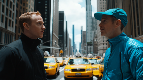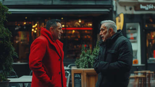 a man in all black asking an old new york man in all red, close up shot chest up of the men both standing up, behind is a simple restaurant with minimalstic vibes and some green in New York, during the middle of the day --ar 16:9