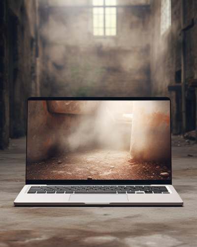 A mockup with a macbook laptop standing on abstract rustic concrete shapes, natural lighting, professional photograph, professional lighting --ar 4:5