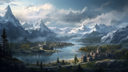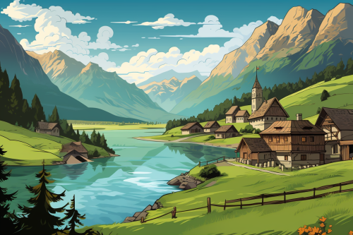 comic illustration style, landscape illustration of a European village with wooden houses surrounded by mountains and a small lake at the end of the landscape --ar 3:2