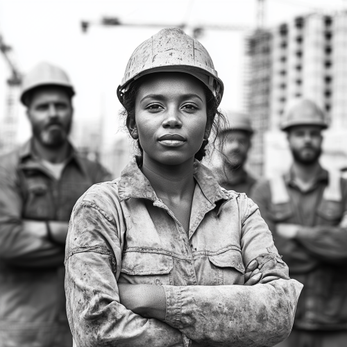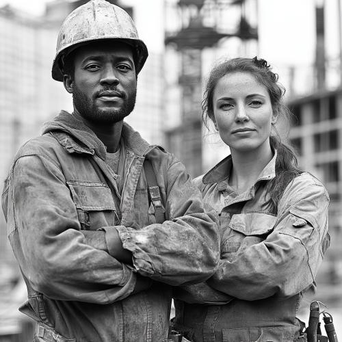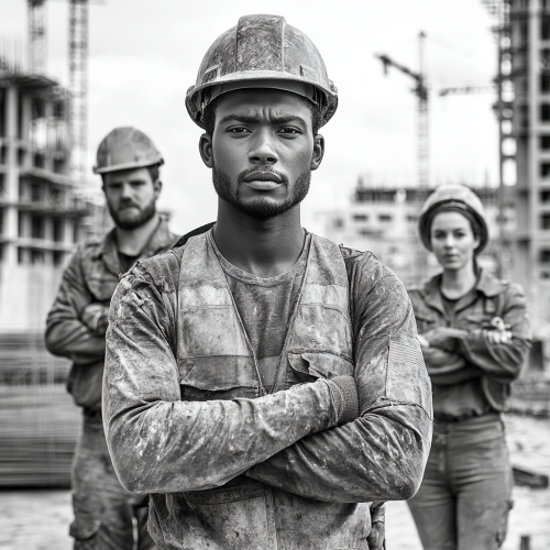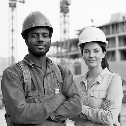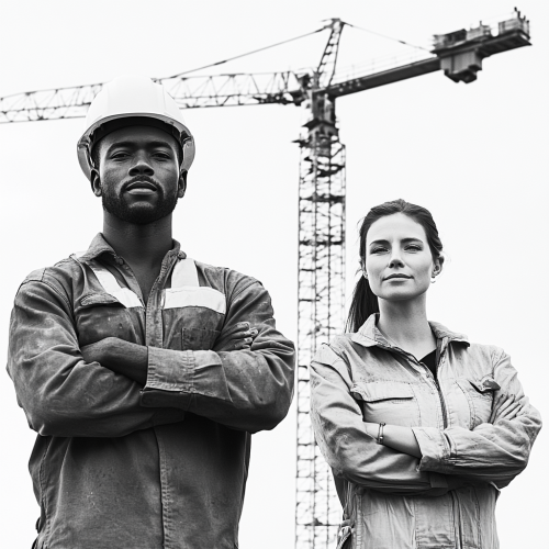 Front image of a builder african man and european architect woman and other group of workers in the construction with their hands folded, wearing dirty builder's clothes with helmet black and white photo with light background of building under construction with crane and other workers, clean and sharp lines