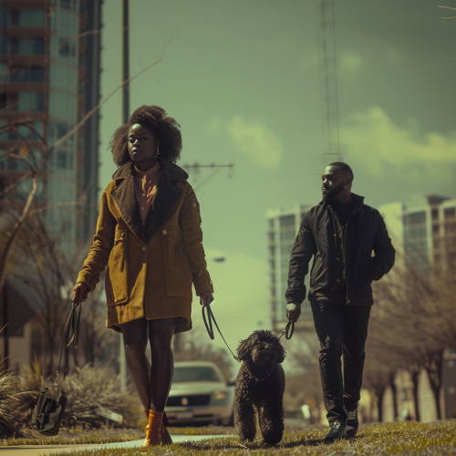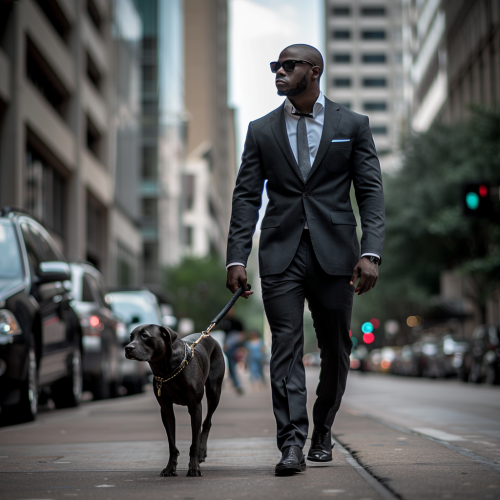 a young black attorney walking down the street like a dog on a leash & collar in downtown Houston, Texas, modern pop look, accurate, true to life, high detail, 35mm lens, shot on DSLR Canon 5D, clean sharp focus, professional color --v 6.0