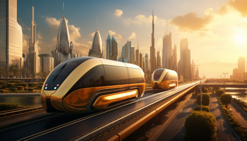 City Skyline, skyline features a fusion, Arabian, structures. The buildings have a golden, Electric Vehicle (EV, electric vehicle is cruising, road. The vehicle, aerodynamic design --ar 7:4