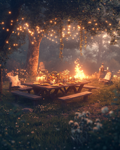 Woodland Dining Venue in Evening Light – A beautifully decorated long dinner table set outdoors in a forest. Elegant linens, stylish tableware, soft candlelight, surrounded by trees. Gentle, warm lighting adds a magical ambiance. Ideal for a corporate gathering. --v 6.0 --s 50