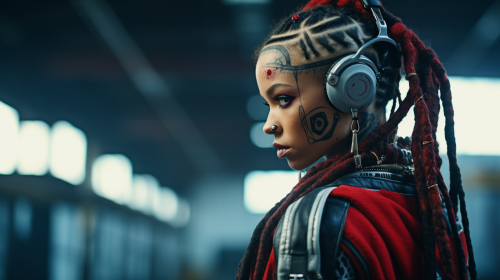 cinematic frontal shot of woman with black and red braids, having many face tattoos and wearing headphones, standing in an industrial building, cyberpunk style, abstract futurstic, hyper realistic --ar 16:9 --v 5.2