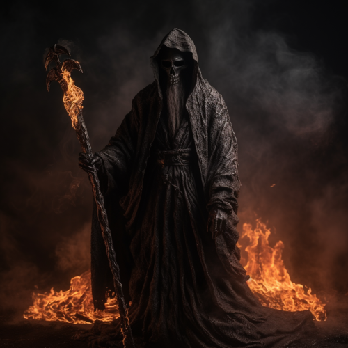 Death with a scythe stands against a black background, with fire burning around him. Ultra high quality photo, 4k --v 5.2