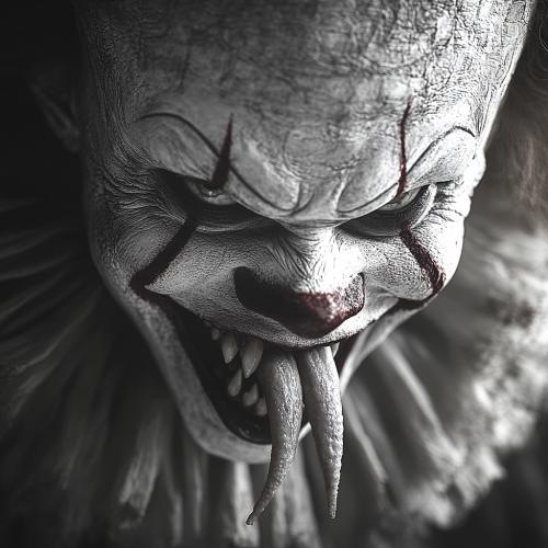 clown from movie Pennywise with long sharp evil teeth and evil look. Tongue out pointe almost like a tentakel, realistic black and white photo, pure evil --s 750 --v 6.1