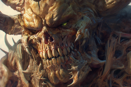 close up of face of giant muscular monster with a bone exoskeleton armor and a evil skull head + horror + art style of Capullo, Brom, Whelan, aly fell rutkowski, art germ, rossdraws, and franzzeta + art station + ultra detailed + hyper realistic + 8k --ar 3:2 --niji 6