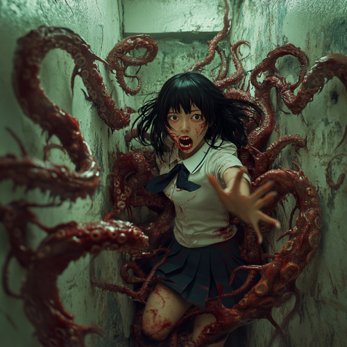 a Japanese teenager, in her school uniform, coming out of a wall, she has tentacles everywhere and a jaw full of sharp teeth, in the style of juji into, v6
