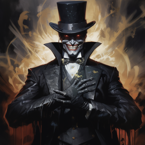 full body portrait of a crazy male supervillain wearing a top hat a black suit and has white face paint on, he has a goatee, he is wearing black gloves and has an evil grin on his face, esad ribic comic book style