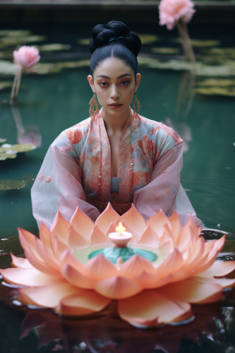 Candid closeup photo of an eccentric traditional Japanese lotus queen, placing a lotus shaped bowl of fire in water, haute couture, symmetry, colorful palace gardens, river with bowls of fire, summer, pastel colors --ar 2:3 --v 5.2