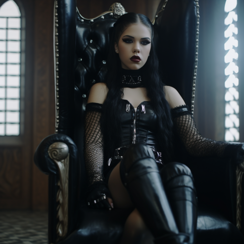 beautful maggie lindemann latina wearing latex evil queen and she is the beautful goddess evil queen in a dvd screengrab from a 1980s dark fantasy flm, dark empty castle, haunted, sitting in throne in blak thigh high boots, silver crown, stone chamber and empty cold cracks