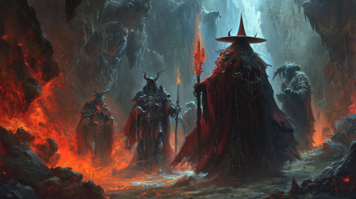 Image of a single long and skinny magical wand on a wizard desk. The wand is a variant of the evil wizard want from harry potter but is carved with multiple evil runes and made of rough dark purple wood. The desk is barely lit by a single red candle laying on a stack of books. The focus and details are on the wand that is entirely visible on the desk. Magic, hyperrealistic, detailed, dynamic lighting, ominous and dark atmosphere