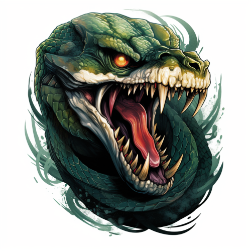 illustration for a tattoo with an evil snake, sharp teeth, green colours, fangs, open mouth, rattle snake, no background