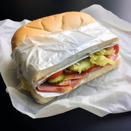 amateur and low quality photograph of a flattened sandwich wrapped in a paper napkin --v 5.2