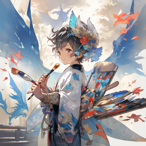 A Female painter with blue and green fairy wings who wears a Yokai mask and feudal japan clothing, making drawings come to life with her magic, battle pose --s 250 --niji 5