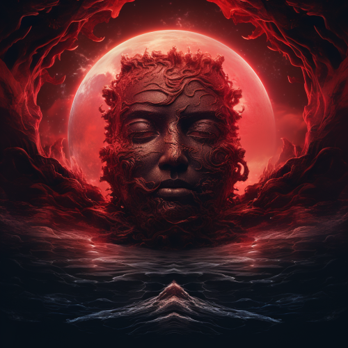 Foreboding Windego evil mythological creature, wide shot red coloured cloud face moon galaxy double exposure, moonlit, reflections in water, gothic, meticulously hyperdetailed digital art, maximalist dystopian detailed elaborate, flickering light
