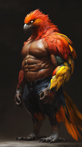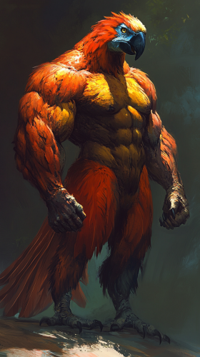 Imagine a towering figure with the body of a bodybuilder, hulking and muscled to extreme proportions, almost reminiscent of the Hulk. Its whole body is covered completely in red, orange, and yellow feathers highlighting its immense strength. Perched atop this massive physique is a relatively small head resembling that of a Kelenken guillermoi, with a sharp, powerful beak that contrasts with its enormous body. Its small eyes, glowing with bright white pupils, give it an intense, focused stare, as if sizing up its next challenge. The juxtaposition of its hulking body and small bird head creates an imposing, yet bizarrely fascinating creature. --ar 9:16 --v 6.1