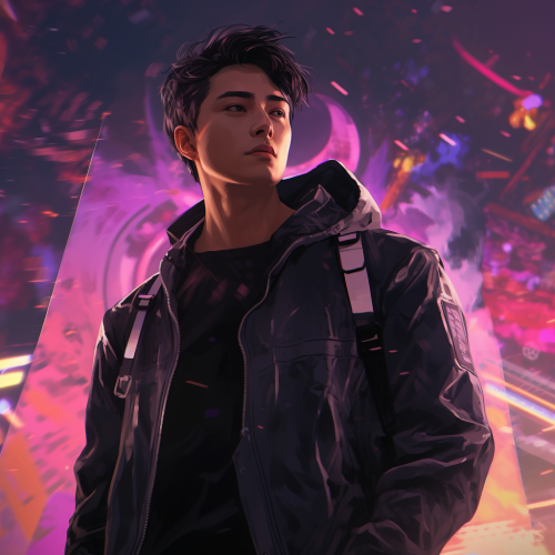 Japanese male of normal build in his 20s wearing sportswear. He has short black hair and is 173 cm tall. His clothes are a sporty-looking jacket and pants style, using shades of purple and pink. The background is a futuristic nighttime soccer field.