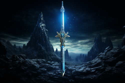 A knight in golden-black armor and a flowing cloak holding with both hands a golden sword that is embedded on a rock, golden light ultra realistic, High resolution, realism 4k --v 6.0